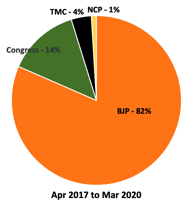 Electoral Bonds worth ₹5,170 crores were donated to India's 8 national political parties between Apr 2017 and Mar 2020. Of these, 82% were to BJP (₹4,216 crores), 14% to Congress party (₹716 crores), 4% to Trinamool Congress (₹198 crores), and 1% to NCP (₹50 crores).