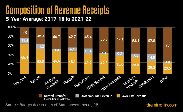 The ten states classified as stressed, account for around half of the total revenue collected by all states. Their total revenue comprises tax revenue, non-tax revenue, and central transfers, i.e., share in central taxes and grants.