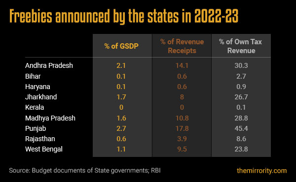 The freebies have exceeded 2 percent of GSDP for some of the highly indebted states such as Punjab and Andhra Pradesh.