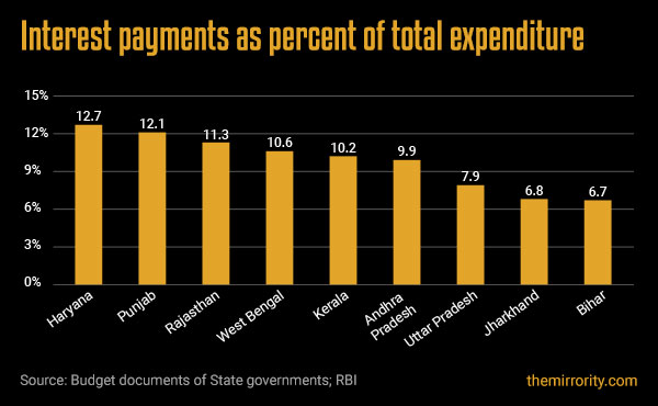 Based on the debt-GSDP ratio in 2020-21, Punjab, Rajasthan, Bihar, Kerala, West Bengal, Madhya Pradesh, Andhra Pradesh, Uttar Pradesh, Haryana, and Jharkhand were the states with the highest debt burden. These 10 states account for around half of the total expenditure by all state governments in India.
